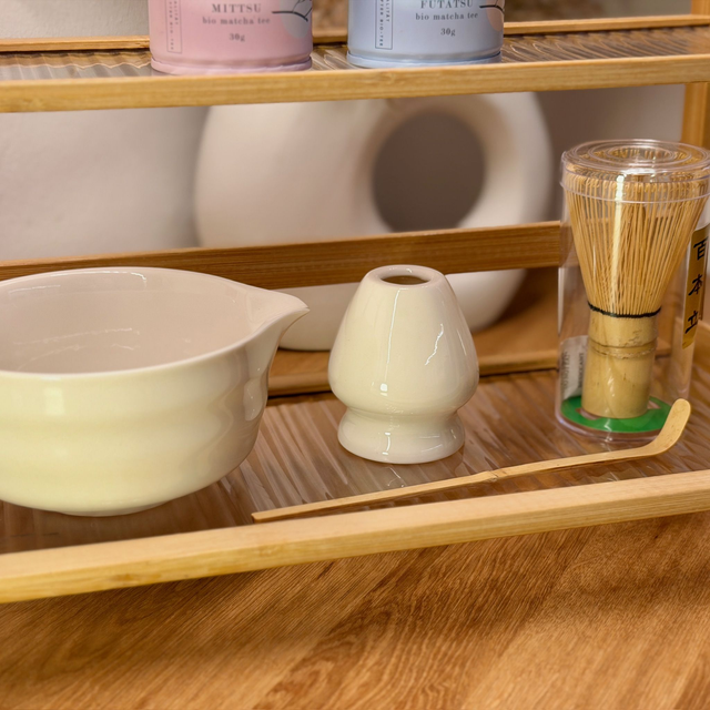 Im Set enthalten sind ausschließlich: Schale, Matcha-Besen, Besenhalter und Matcha-Löffel.