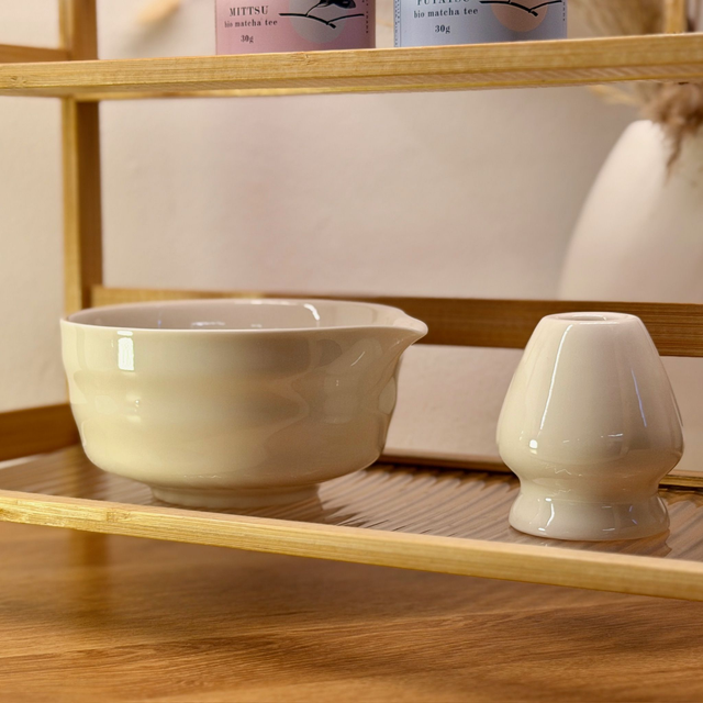 Die Fotos können Deko enthalten. Matcha-Besen und Matcha-Pulver (z. B. Matcha Kāru) sind nicht im Set enthalten und werden separat verkauft. Im Set enthalten sind ausschließlich die Matcha-Schale und der Besenhalter.